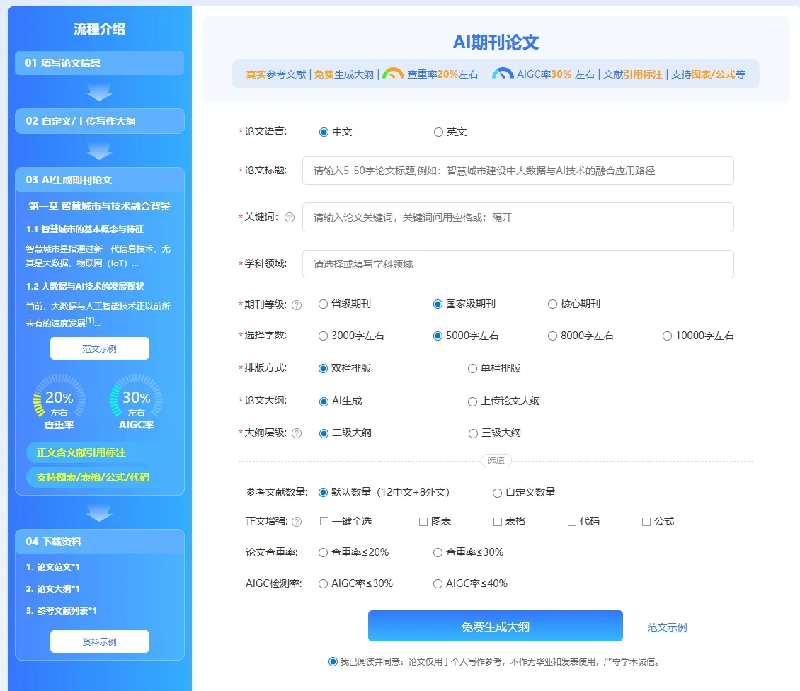 | 紧急初稿撰写 | 1. 选“省心版”输入标题+关键词; 2. 选择字数(如12000字); 3. 30分钟后下载资料包 |